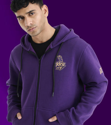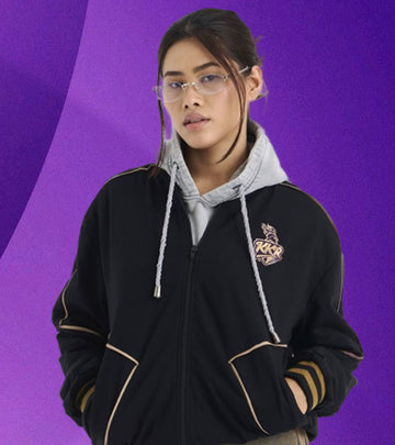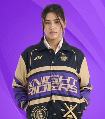 Stay stylish while repping your favorite team with the KKR Black Varsity Jacket—a perfect blend of everyday wearability and premium design. Crafted from high-quality fabric, this jacket offers a comfortable yet structured fit, making it an essential piece for any KKR fan. Designed with golden piping along the shoulders and front panels, this jacket exudes a refined edge, while the golden tipping on the bottom of the front pockets adds a subtle touch of elegance.Own the legacy. Wear the pride. #AmiKKR #KorboLorboJeetb